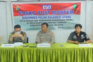 Hal tersebut disampaikan Kabid Dokkes Polda Sulut Kombes Pol dr. Sucipto didampingi Kepala Rumah Sakit Bhayangkara Tingkat III Manado AKBP dr. F. Zulkarnaen dan Kaur Penum Subbid Penmas Bidang Humas Polda Sulut berhasil teridentifikasi. Selfie Torondek, saat konferensi pers di Posko Post Mortem Bidang Dokkes Polda Sulut, Kamis (9/3/2023) sore.
