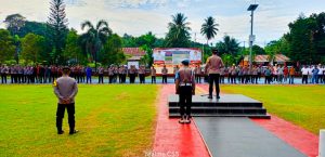 Kapolres Minahasa Selatan (Minsel) AKBP Arianto Salkery, SH, MH; selaku Kaopsres Mantap Praja Samrat 2024, memimpin apel personel pengamanan kampanye Pilkada 2024, di halaman utama Polres Minsel, Rabu (25/09/2024).