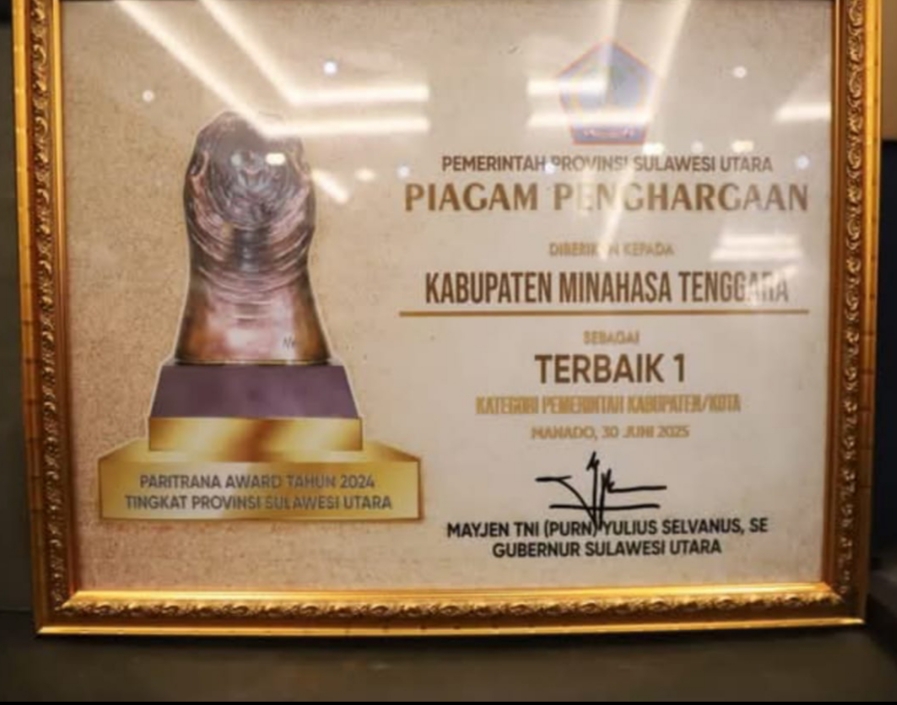 Bupati Minahasa Tenggara (Mitra), Ronald Kandoli, menerima piagam penghargaan terbaik I dalam Paritrana Award 2024 tingkat Provinsi Sulawesi Utara atas komitmen luar biasa dalam perlindungan jaminan sosial ketenagakerjaan.