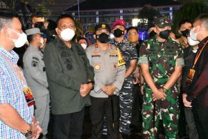 Komandan Pangkalan Utama TNI AL (Danlantamal) VIII Manado Brigjen TNI (Mar) I Wayan Ariwijaya, S.E., CFrA mendampingi Gubernur Sulawesi Utara (Sulut) Olly Dondokambey memantau situasi malam tahun baru di Kota Manado. Sabtu (01/01).