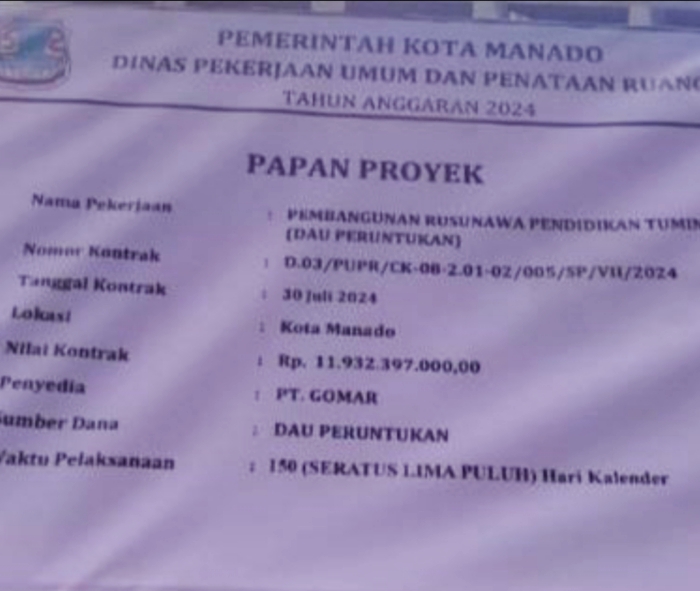 Berdasarkan pada papan informasi proyek, pekerjaan pembangunan Rusunawa Pendidikan Tuminting bernilai kontrak Rp.11,9 Milyar, tanggal kontrak pekerjaan proyek yang dimenangkan PT. GOMAR tersebut tertera 30 Juli 2024 dan dijadwalkan selesai dengan waktu pelaksanaan 150 (Seratus lima puluh) hari kalender. Selasa ( 13/05/2025 )