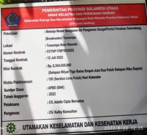 Terkait proyek pekerjaan Bangunan Pengaman Sungai/ Pantai penahan gelombang yang di kerjakan oleh Dinas Kelautan dan Perikanan Provinsi Sulawesi Utara tahun 2022, pelaksanaya CV Adalle Cipta Bersama dengan pengawas CV Kelby Konsultan dengan anggaran APBD (DAK) Rp.8.304.028.000 di nilai sudah memenuhi standar oleh Kadis Tineke, Jum’at (10/03/2023).