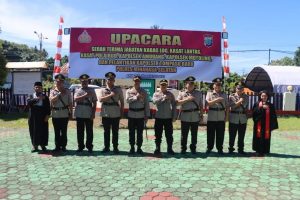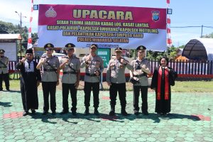 Polres Minsel menggelar upacara serah terima jabatan (Sertijab) Kabag Log, Kasat Lantas, Kasat Polairud, Kapolsek Amurang, Kapolsek Motoling dan pelantikan Kapolsek Tompasobaru.