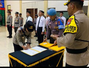 Upacara serah terima jabatan (Sertijab), pelantikan dan pengambilan sumpah pejabat Polri dilaksanakan di Graha Tatag Trawang Tungga Polres Minsel, Senin (21/10/2024).