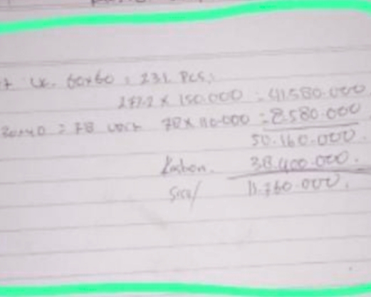 Dalam hitunganya, Ramdan cs, mengungkap total yang harus dibayarkan Rp 50.160.000 dipotong kasbon Rp 38.400.000, sisa Rp 11,760.000. Sisa bayar tersebut hingga pekerjaan itu selesai pada 14 Oktober 2025, tidak dibayarkan mandor PT Goartha Abadi.
