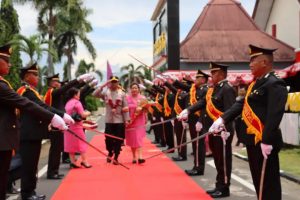 Kapolres Minsel AKBP Feri Renaldo Sitorus, SIK,MH bersama Ketua Bhayangkari Cabang Minsel Ny. Sally Feri Sitorus, disambut di depan pintu gerbang oleh Wakapolres Kompol Muhammad Fadli, SIK dan Wakil Ketua Bhayangkari Cabang Minsel Ny. Via Fadli.