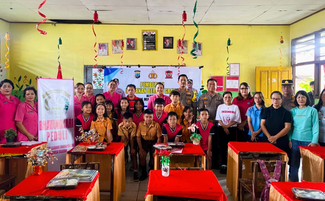 Kapolres Minahasa Selatan (Minsel) AKBP David Candra Babega, SIK, MH; dan Ketua Bhayangkari Cabang Minsel Ny. Qori David Candra, bersama sejumlah pejabat utama, Pengurus Bhayangkari dan personel Polwan, membagikan ratusan paket MBG (makan bergizi gratis) untuk anak-anak sekolah, Jumat (07/02/2025).