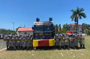Ratusan personel Polres Minahasa Selatan (Minsel) melaksanakan gladi bersih simulasi sispamkota, dalam rangka pengamanan pemilu tahun 2024.