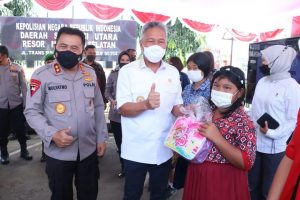 Pada kesempatan tersebut, Kapolda Sulut menyerahkan bingkisan sembako kepada warga yang mengikuti vaksin, yakni kelompok lansia, dewasa serta peralatan sekolah untuk anak usia 6-11 tahun.
