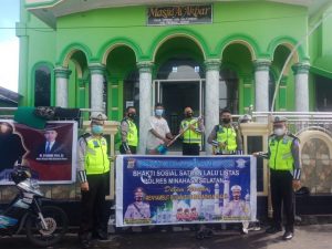 MINSEL, AngkatanMerdeka.com- Personel Satuan Lalu Lintas (Satlantas) Polres Minahasa Selatan (Minsel) menggelar bakti sosial di Masjid Al-Akbar Desa Tumpaan Satu, Kecamatan Tumpaan, Jum’at (23/04/2021) pagi.