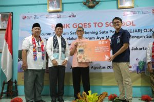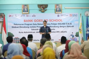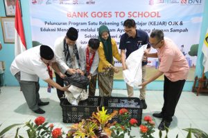 Walikota Kota Administrasi Jakarta Utara, Ali Maulana Hakim melakukan pencanangan Program Satu Rekening Satu Pelajar OJK (Kejar OJK) di SMPN 270, Pegangsaan Dua, Kelapa Gading, Jakarta Utara, Jumat (11/8). Sebanyak 44 sekolah Adiwiyata se-Jakarta Utara diberikan edukasi menabung melalui program ‘Ayo Menabung Dengan Sampah’.